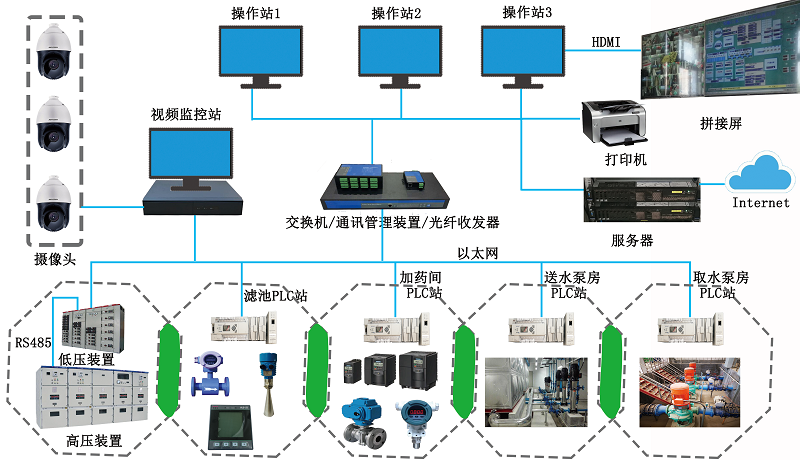 取水泵房、加礬加氯處理站、沉淀濾池處理站、送水泵房、視頻監(jiān)控系統(tǒng)、中控室、水處理設(shè)備、配套高低壓柜等組成。